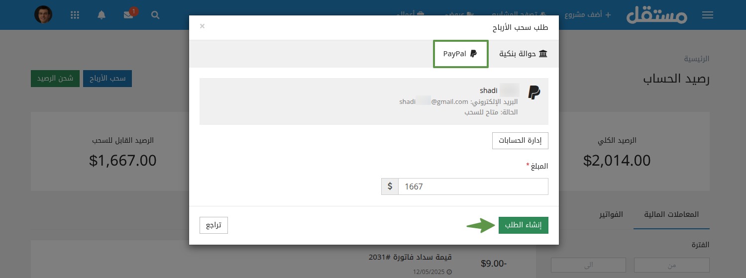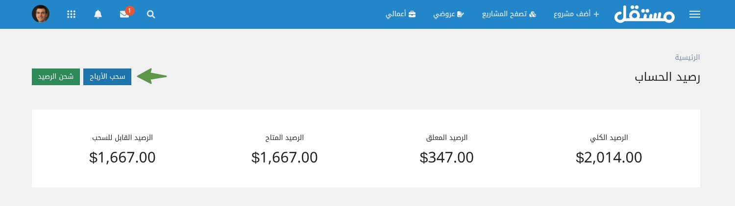 يمكنك سحب الأرباح التي انتهت مدة تعليقها، علمًا بأن مدة التعليق هي 14يوم عمل تبدأ من اليوم التالي لتسليم المشروع. لسحب الأرباح اتبع الخطوات التالية: