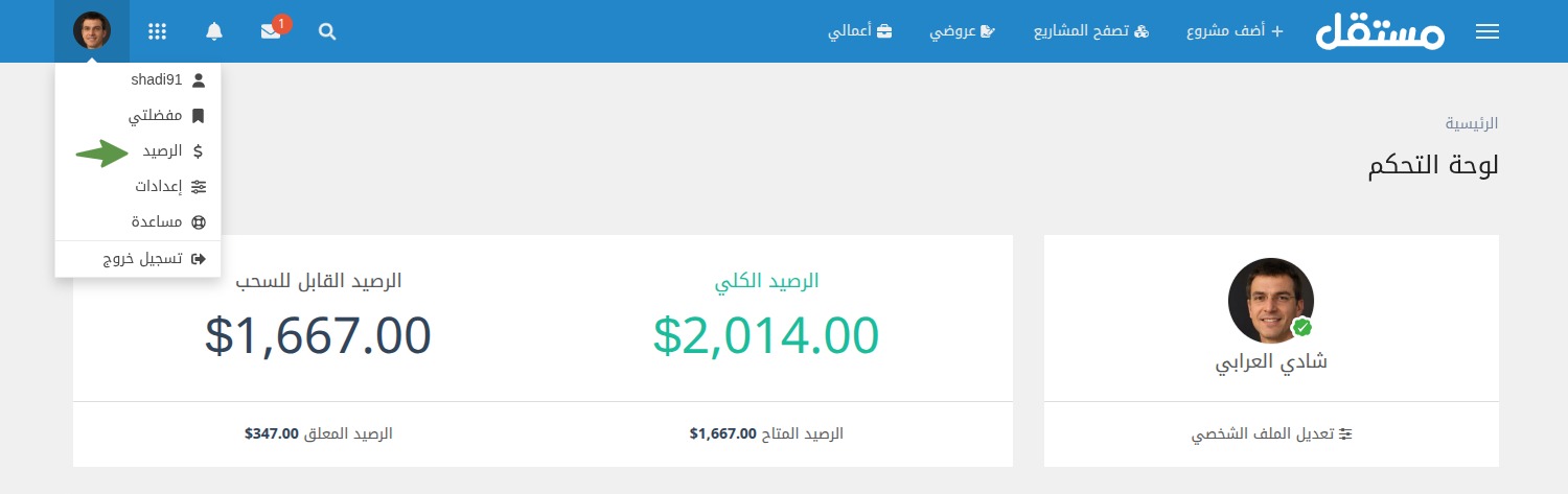 أنقر على قسم الرصيد الموجود في صفحة الموقع الرئيسية، أو انقر على صورتك الشخصية واختر الرصيد.